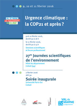 Déroulement des JSE 2016La programmation des JSE 2016 se poursuivra du 9 au 11 février 2016 à l’Hôtel du département, avec des conférences et tables rondes. Elles seront animées par des chercheurs, doctorants, professionnels et acteurs de la société civile sur la thématique du changement climatique :